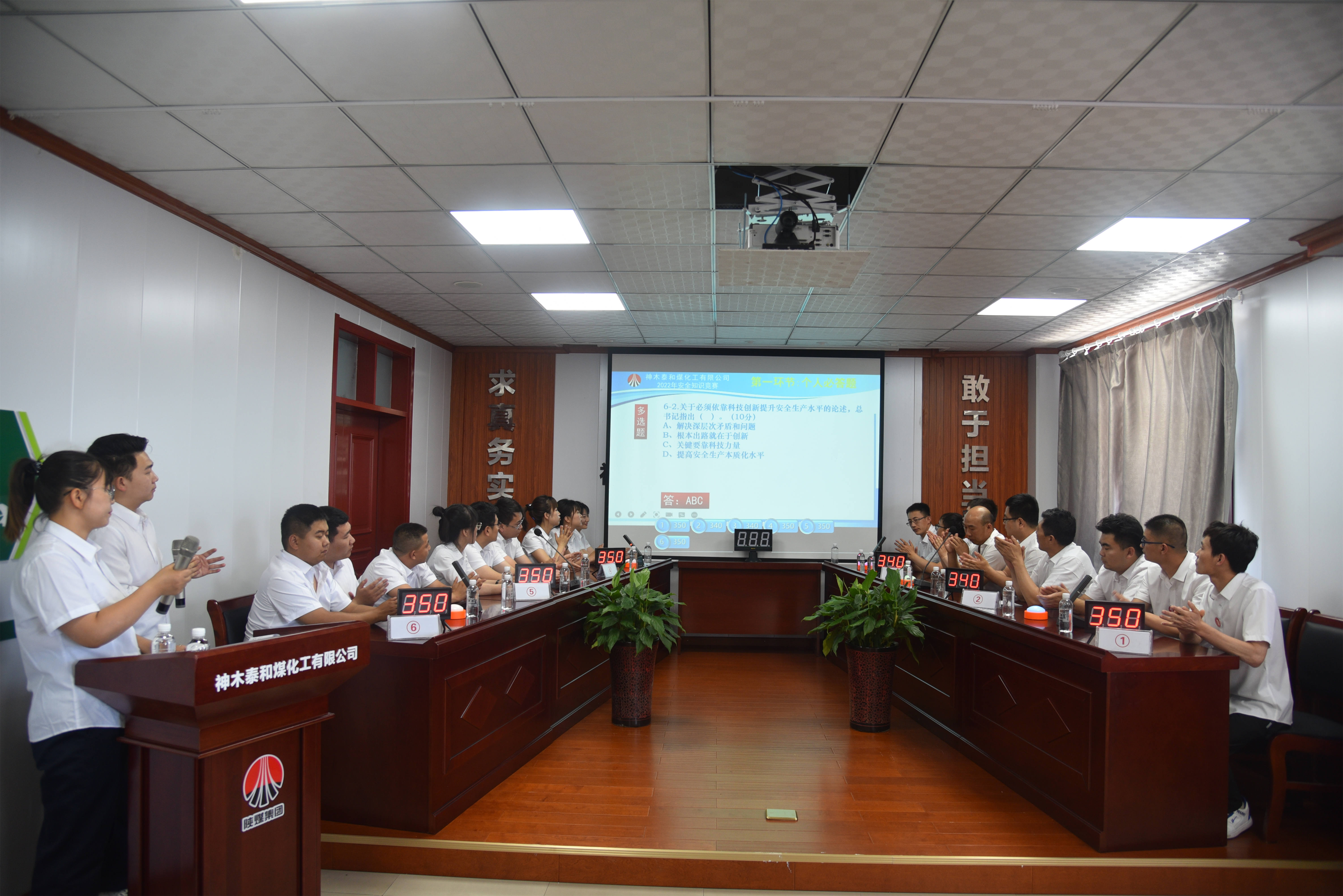 6月15日下午,神木煤化工泰和公司舉辦了“學法規(guī)、轉(zhuǎn)觀念、抓落實、強管理、迎盛會”安全生產(chǎn)普法知識競賽活動。神木應急管理局中隊長劉國平、神木煤化工公司安全生產(chǎn)環(huán)保部人員,泰和公司董事長王志忠及領(lǐng)導班子成員,泰和公司員工共計70余人觀看了競賽。