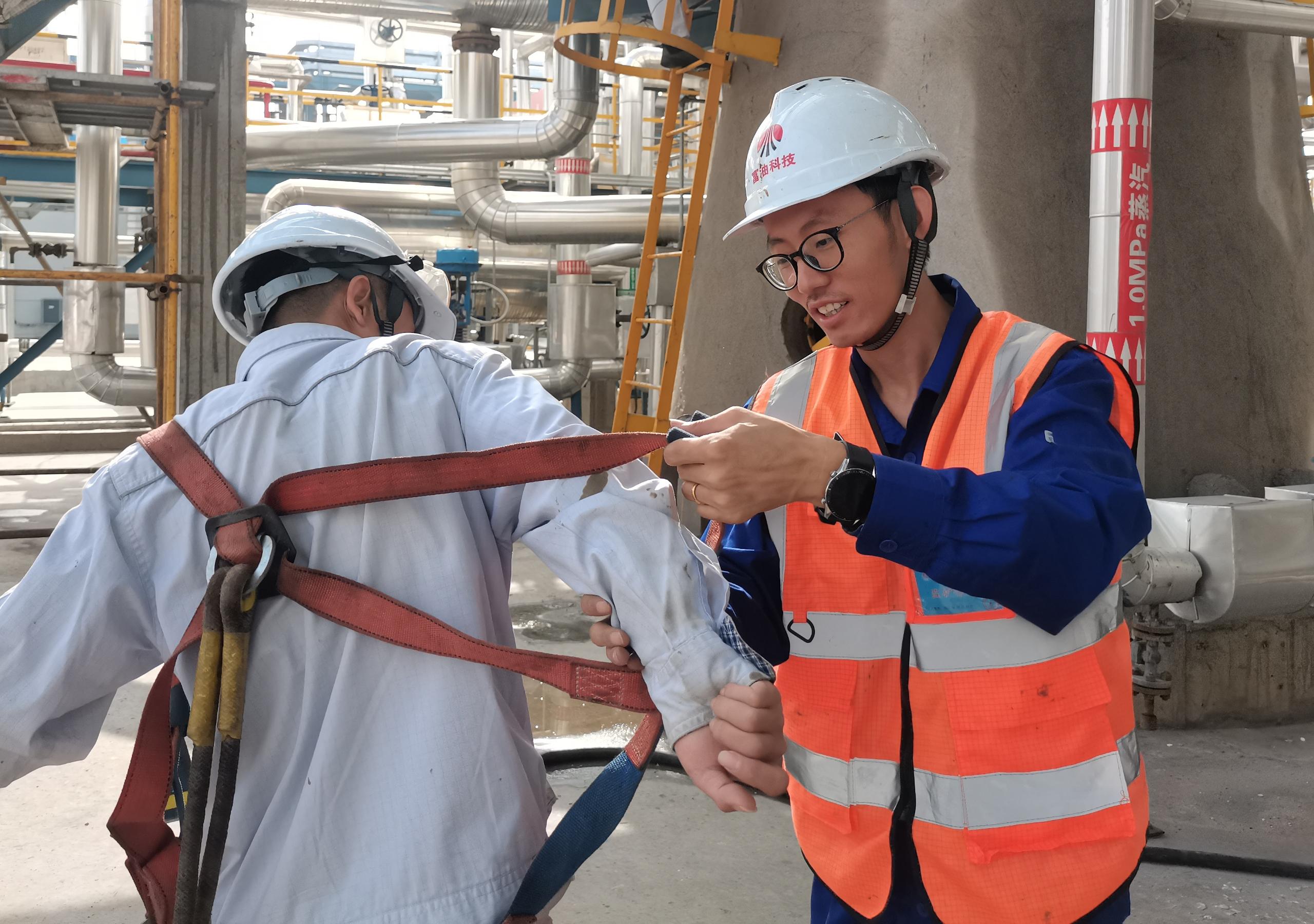 “師傅,這個(gè)全身式安全帶我?guī)湍愦┐骱茫日{(diào)整好安全帶的高低,防止太高,緊急情況下收緊勒到你脖子,對(duì)你的身體造成傷害,太低了無(wú)法限制身體向前沖,滑出肩膀就十分危險(xiǎn)了,留兩根手指的空隙比較合適,才能有效保障你的高處作業(yè)安全”,F(xiàn)TH中心班長(zhǎng)張啟龍一邊說(shuō)著一邊幫助檢修人員規(guī)范地系上了安全帶。