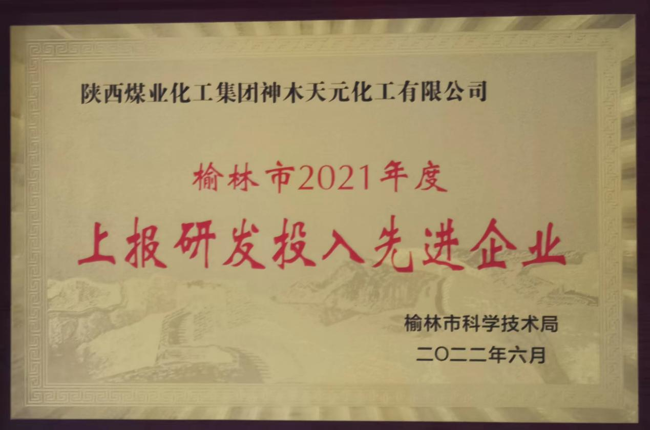 天元公司榮獲榆林市“2021年度上報研發投入先進企業”