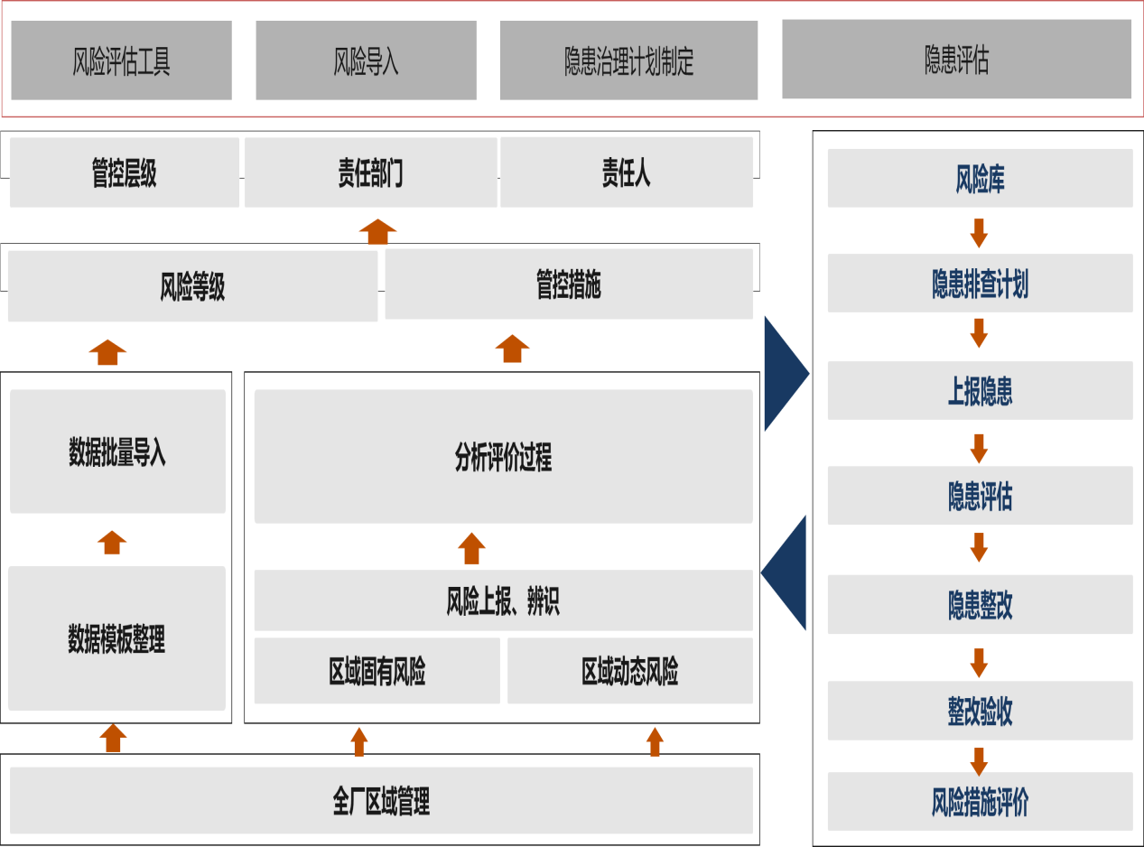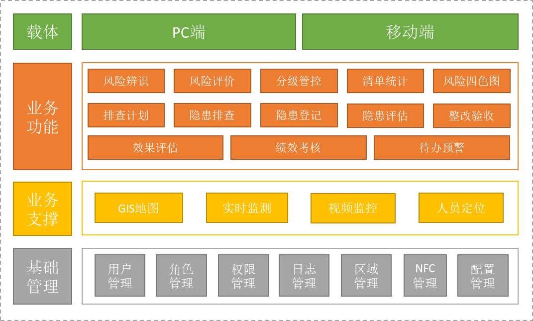 其中,風(fēng)險分級管控功能模塊利用風(fēng)險隱患庫的數(shù)據(jù)支撐,助力基層管理人員的風(fēng)險辨識登記、評價分級、管控措施制定等一系列風(fēng)險分級管控工作,實現(xiàn)了對安全管理風(fēng)險源頭治理、關(guān)口前移,全面匯總管理區(qū)域內(nèi)的風(fēng)險隱患并輸出符合風(fēng)險分級管控相關(guān)管理要素的清單、報表;隱患排查治理功能模塊涵蓋了安全隱患排查治理各環(huán)節(jié)基本要素和工作內(nèi)容,通過PC端和手機APP實現(xiàn)以安全隱患排查治理業(yè)務(wù)為主線的移動線上管理,能夠?qū)﹄[患排查治理及時、有效跟蹤,實現(xiàn)隱患排查、上報、整改、驗收、記錄留痕、表單存檔閉環(huán)管理;數(shù)據(jù)監(jiān)測中心功能模塊基于電子地圖進(jìn)行相關(guān)數(shù)據(jù)、信息展示服務(wù),通過不同的圖層切換,實現(xiàn)危險源、安全隱患、特殊作業(yè)分布、有毒可燃?xì)怏w監(jiān)測、視頻監(jiān)控多種專題圖的可視化形象展示。