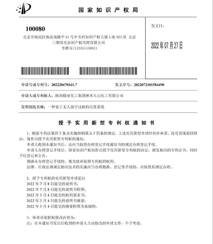 7月27日,神木煤化工天元公司申請的“一種基于無人值守過磅的出貨系統(tǒng)”實(shí)用新型專利獲得國家知識產(chǎn)權(quán)局授權(quán)。