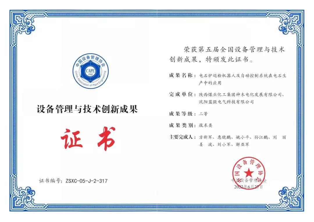 近期,中國設備管理協會在武漢舉辦第五屆全國設備管理與技術創新成果交流大會。神木煤化工電化公司“電石爐巡檢機器人及自動控制系統在電石生產中的應用”項目榮獲第五屆全國設備管理與創新技術成果二等獎,該獎項是全國各地區各行業設備全壽命周期管理、設備創新與智能化、綠色安全的專業性獎項。