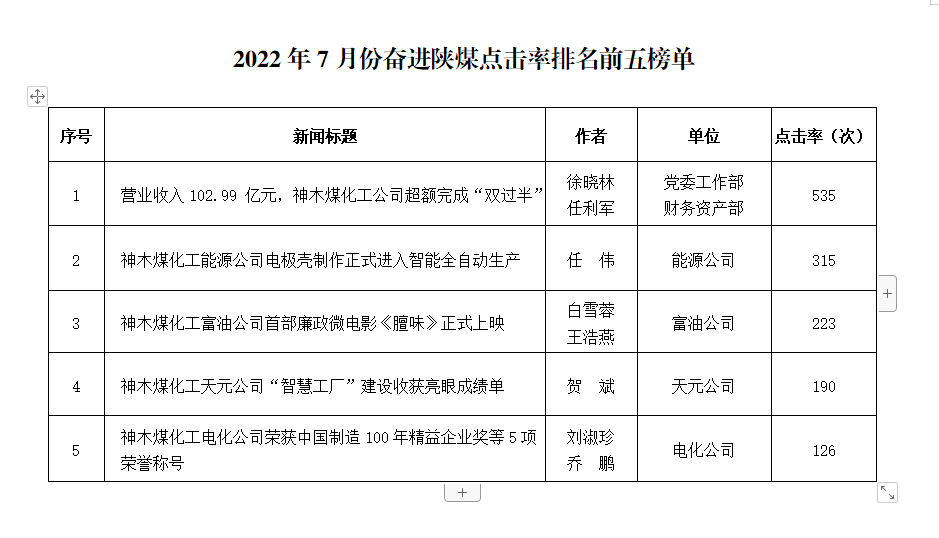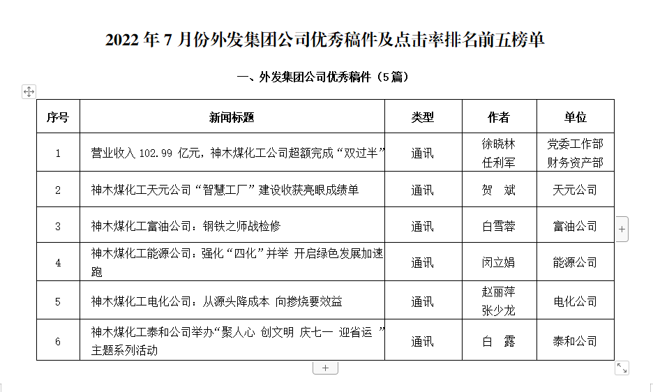 關于2022年7月份神木煤化工公司發稿及優秀稿件評選情況的通報