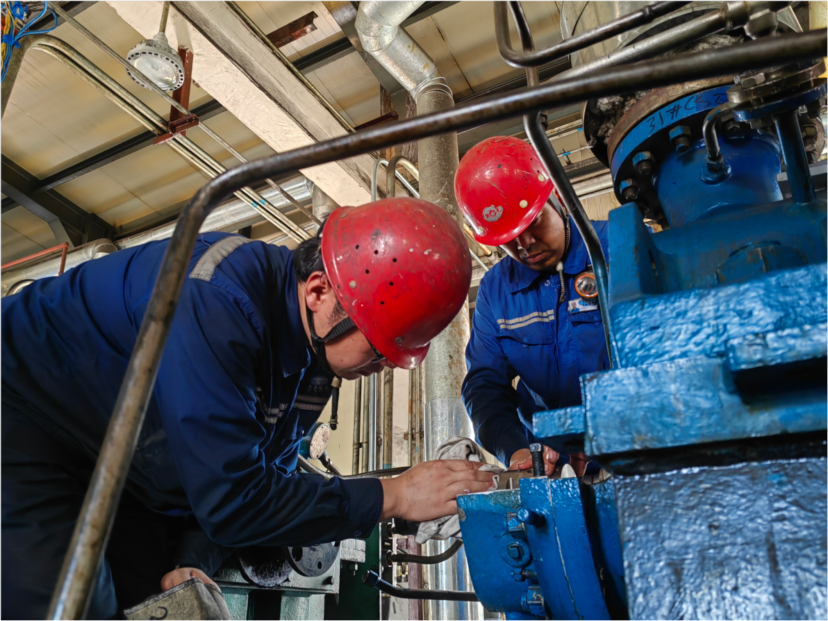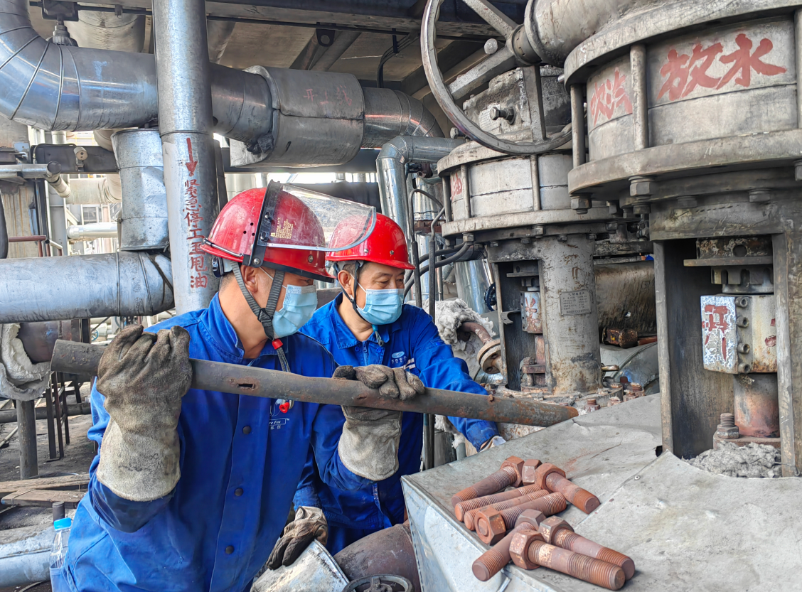 檢修車間張福恩和汪起云在更換預處理車間氣動旋塞閥
