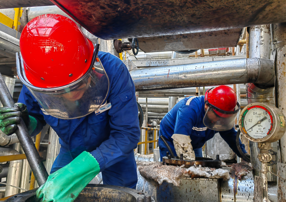 預處理車間張瑞珍和竇玉龍在清理D-1002抽出過濾器