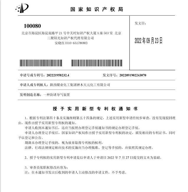 近日,神木煤化工天元公司申請的“一種防堵導氣裝置”實用新型專利獲得國家知識產(chǎn)權局授權。