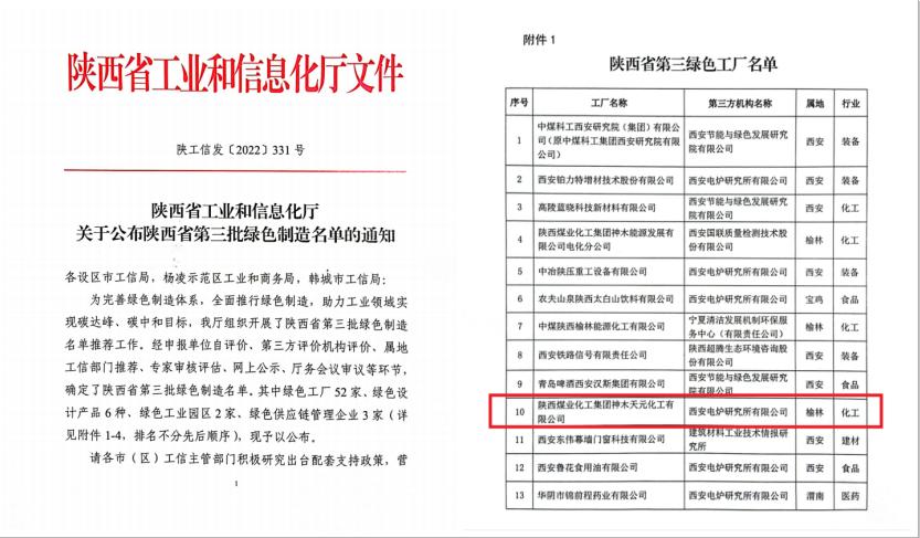近日,從陜西省工業(yè)和信息化廳下發(fā)的《關(guān)于公布陜西省第三批綠色制造名單的通知》獲悉,神木煤化工天元公司入選陜西省第三批綠色工廠名單。