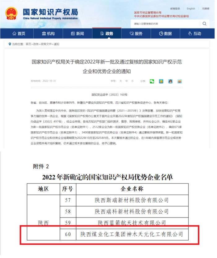 近日,從《國家知識產(chǎn)權(quán)局關(guān)于確定2022年新一批及通過復(fù)核的國家知識產(chǎn)權(quán)示范企業(yè)和優(yōu)勢企業(yè)的通知》獲悉,神木煤化工天元公司入選2022年國家知識產(chǎn)權(quán)優(yōu)勢企業(yè)名單。