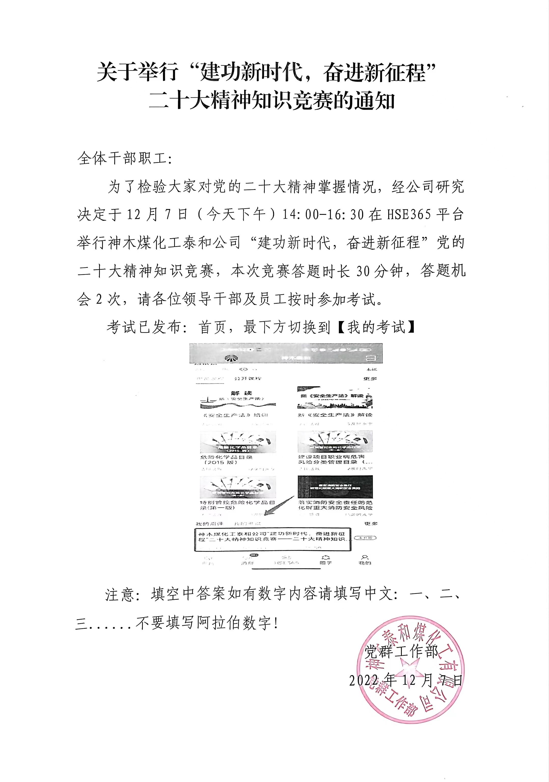 黨群工作部精心制定了本次競賽的活動方案,多次與HSE365平臺管理人員交流溝通,根據平臺功能和考試要求,本著有效又接地氣的命題原則,既競出職工對黨的二十大精神的理解,又不能帶給大家過大壓力。通過微信群提前通知各部門、車間負責人將此次競賽傳達至每一名職工,并對答題規則進行了詳細的說明。嚴格落實疫情防控要求,采取不聚集,獨自為戰的方式答題,降低交叉感染的風險,多措并舉確保競賽準時開展。
