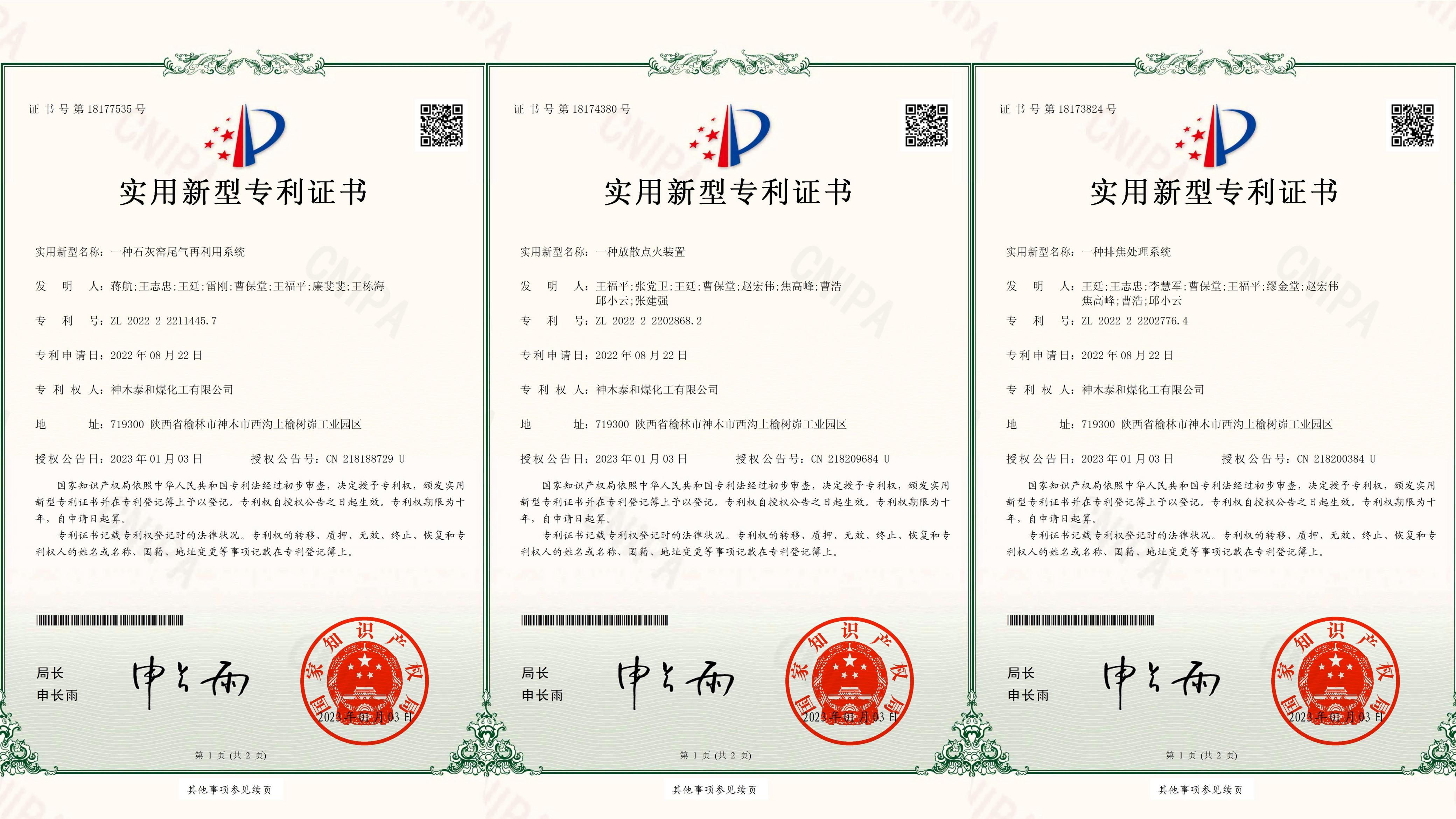近日,神木煤化工泰和公司申請的“一種排焦處理系統”“一種放散點火裝置”和“一種石灰窯尾氣再利用系統”獲得國家知識產權局實用新型專利授權。