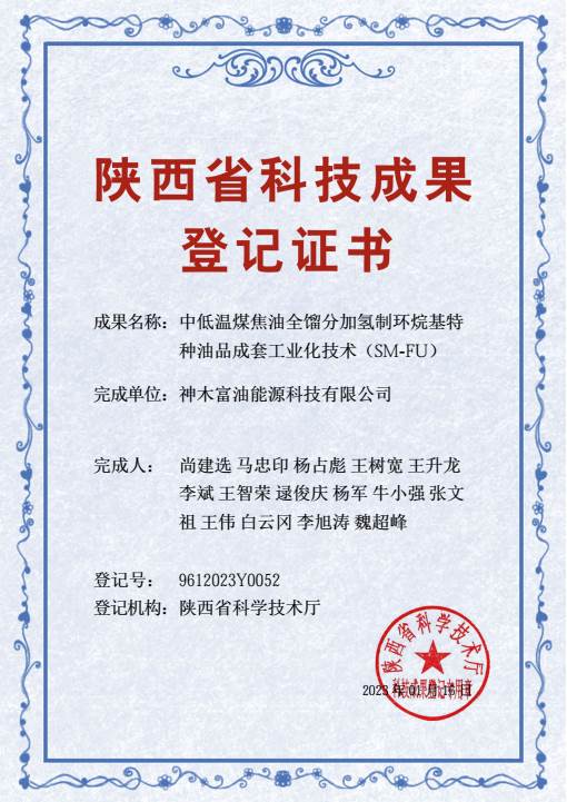 近期,神木煤化工富油公司自主研發的“中低溫煤焦油全餾分加氫制環烷基特種油品成套工業化技術”榮獲了陜西省科學技術廳頒發的科技成果登記證書。