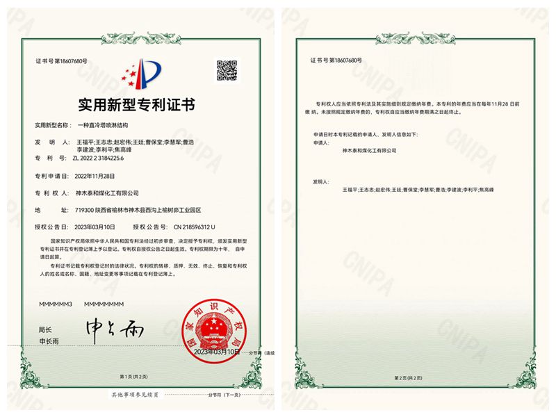 近日,神木煤化工泰和公司自主研發的“一種直冷塔噴淋結構”獲得國家知識產權局實用新型專利授權。