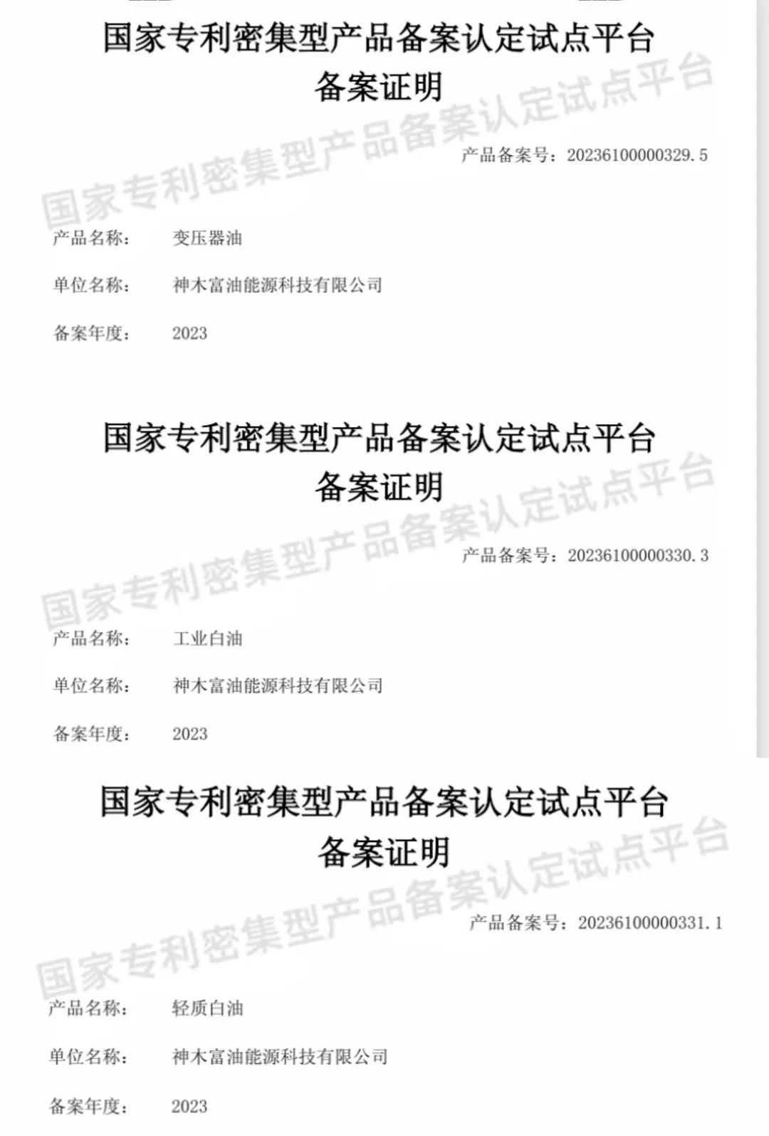 近日,神木煤化工富油公司生產的工業白油、輕質白油、變壓器油在國家專利密集型產品備案認定試點平臺備案成功。