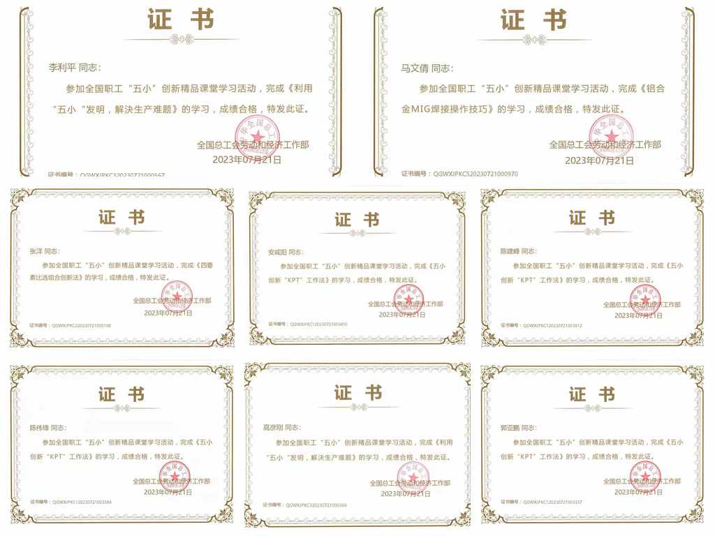 此次學習內容包含《五小創新“KPT”工作法》《四要素比選組合創新法》《利用“五小”發明解決生產難題》等精品課程。活動開始后,大家積極響應,通過認真領會《關于開展全國職工“五小”創新精品課堂學習活動的通知》文件精神,結合自身實際情況選擇學習內容,有計劃、有目的進行學習,并順利取得電子結業證書。