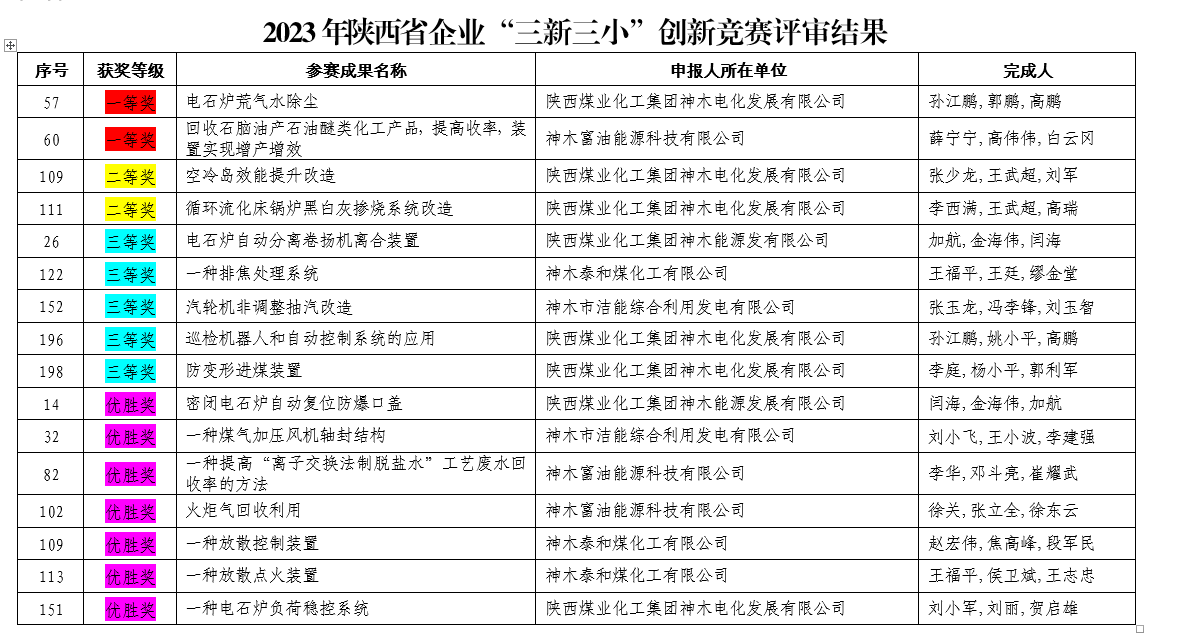 今年以來,神木煤化工公司著力以改革激發創新創造活力,深入推進科技創新成果轉化,有效破解生產經營瓶頸,創新成果不斷涌現,創新能力顯著增強。截至7月底,本年度新增40項專利。所屬各企業共獲得225項專利,其中63項發明專利授權和162項實用新型專利授權。在2023年陜西省企業“三新三小”創新競賽中,神木煤化工榮獲一等獎2項,二等獎2項,三等獎5項,優勝獎7項,申報和獲獎數量創歷史新高。