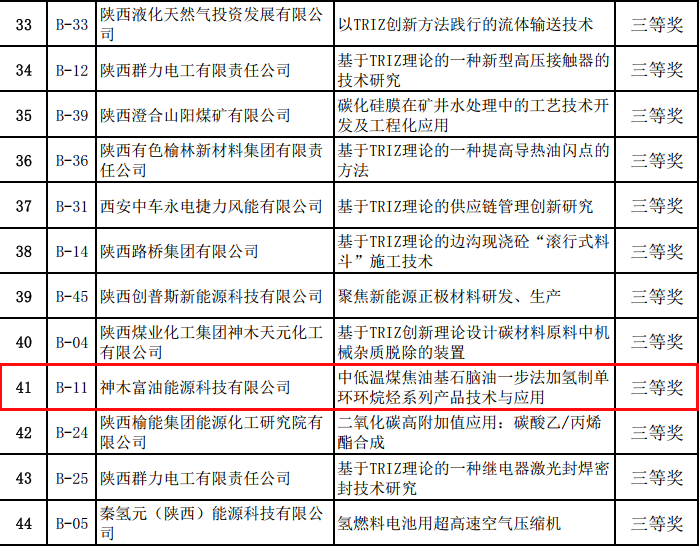 11月上旬,神木煤化工富油公司“基于 TRIZ 創(chuàng)新方法-中低溫煤焦油基石腦油一步法加氫制單環(huán)環(huán)烷烴系列產(chǎn)品技術(shù)與應(yīng)用”創(chuàng)新成果在“秦創(chuàng)原?涇河新城杯”2023年陜西省創(chuàng)新方法大賽中榮獲三等獎(jiǎng)。