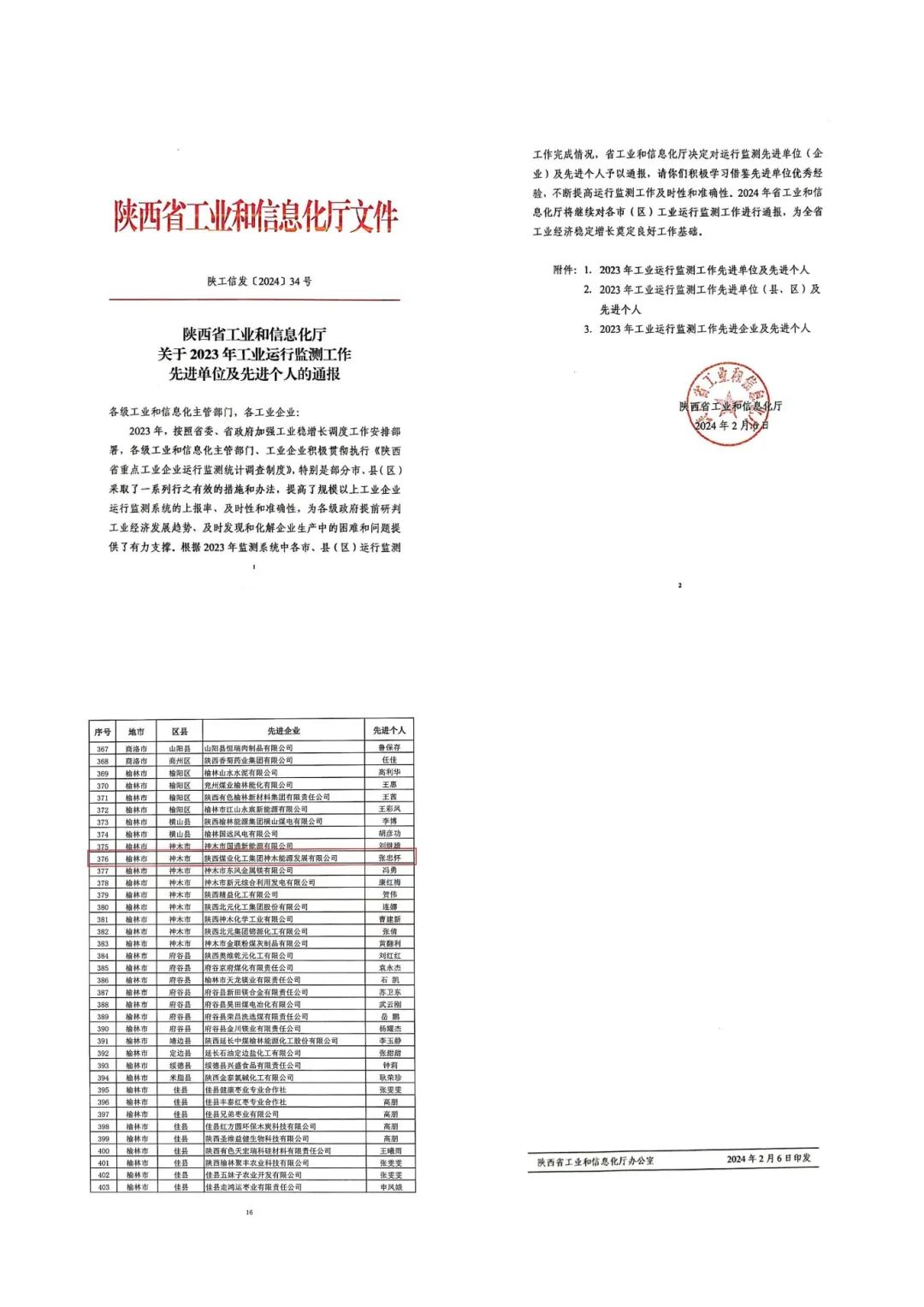新年第一份喜訊!神木煤化工能源公司榮獲陜西省工業和信息化廳“2023年工業運行監測工作”先進單位榮譽稱號