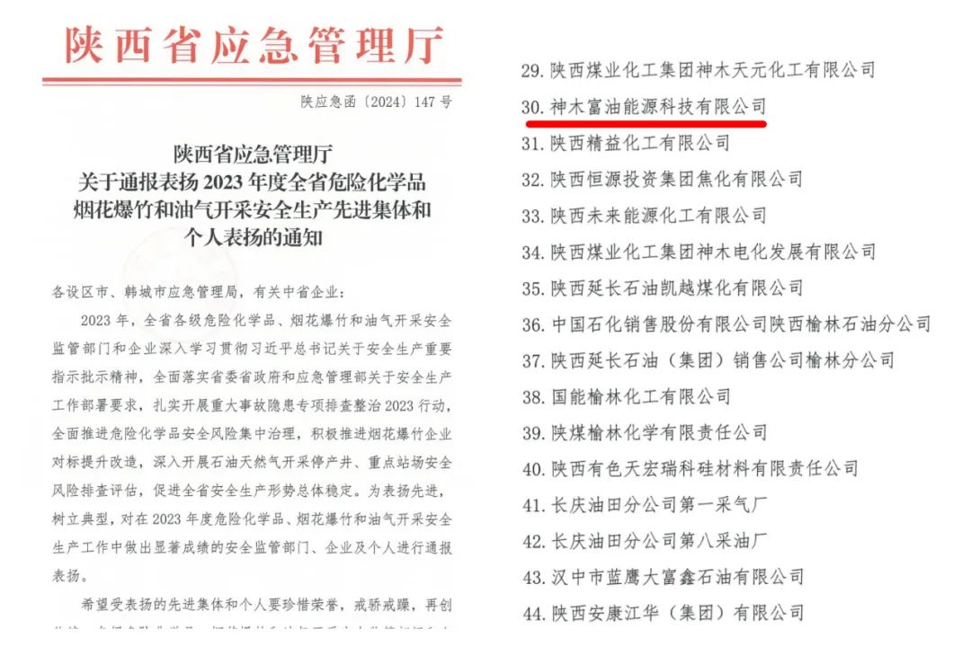 近日,陜西省應(yīng)急管理廳對(duì)2023年度全省危險(xiǎn)化學(xué)品、煙花爆竹和油氣開采安全生產(chǎn)先進(jìn)集體和個(gè)人予以通報(bào)表揚(yáng),神木煤化工富油公司榮獲“2023年度陜西應(yīng)急管理廳危險(xiǎn)化學(xué)品行業(yè)安全生產(chǎn)先進(jìn)集體”稱號(hào)。