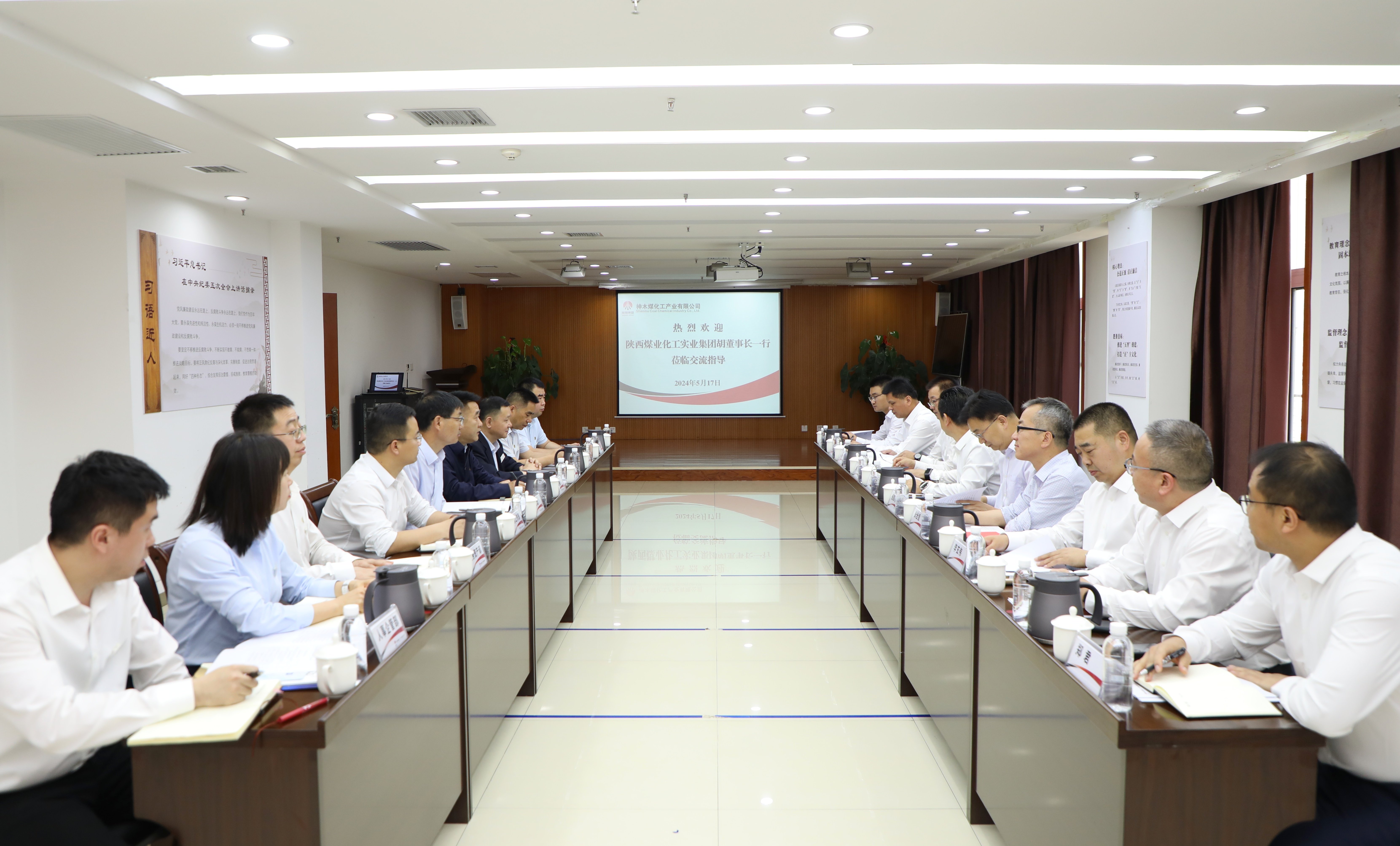 5月17日,陜西煤業化工實業集團黨委書記、董事長、總經理胡守平一行到公司座談交流,公司黨委書記、董事長雷宏春,黨委副書記、總經理辛文輝參加座談。