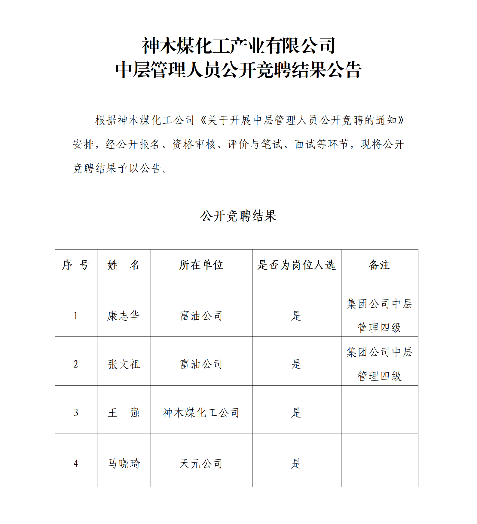 神木煤化工產業有限公司中層管理人員公開競聘結果公告