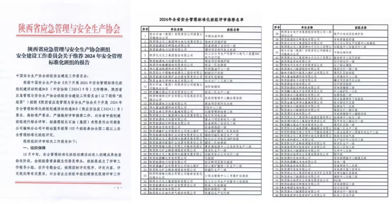 近日,陜西省應急管理與安全生產協會班組安全建設工作委員會發布《關于推薦2024年安全管理標準化班組的報告》。神木煤化工富油公司環烷基油中心一班、公用儲運中心二班及FTH中心二班憑借過硬的安全管理水平,成功獲得全國二級以上安全管理標準化班組評定推薦資格。