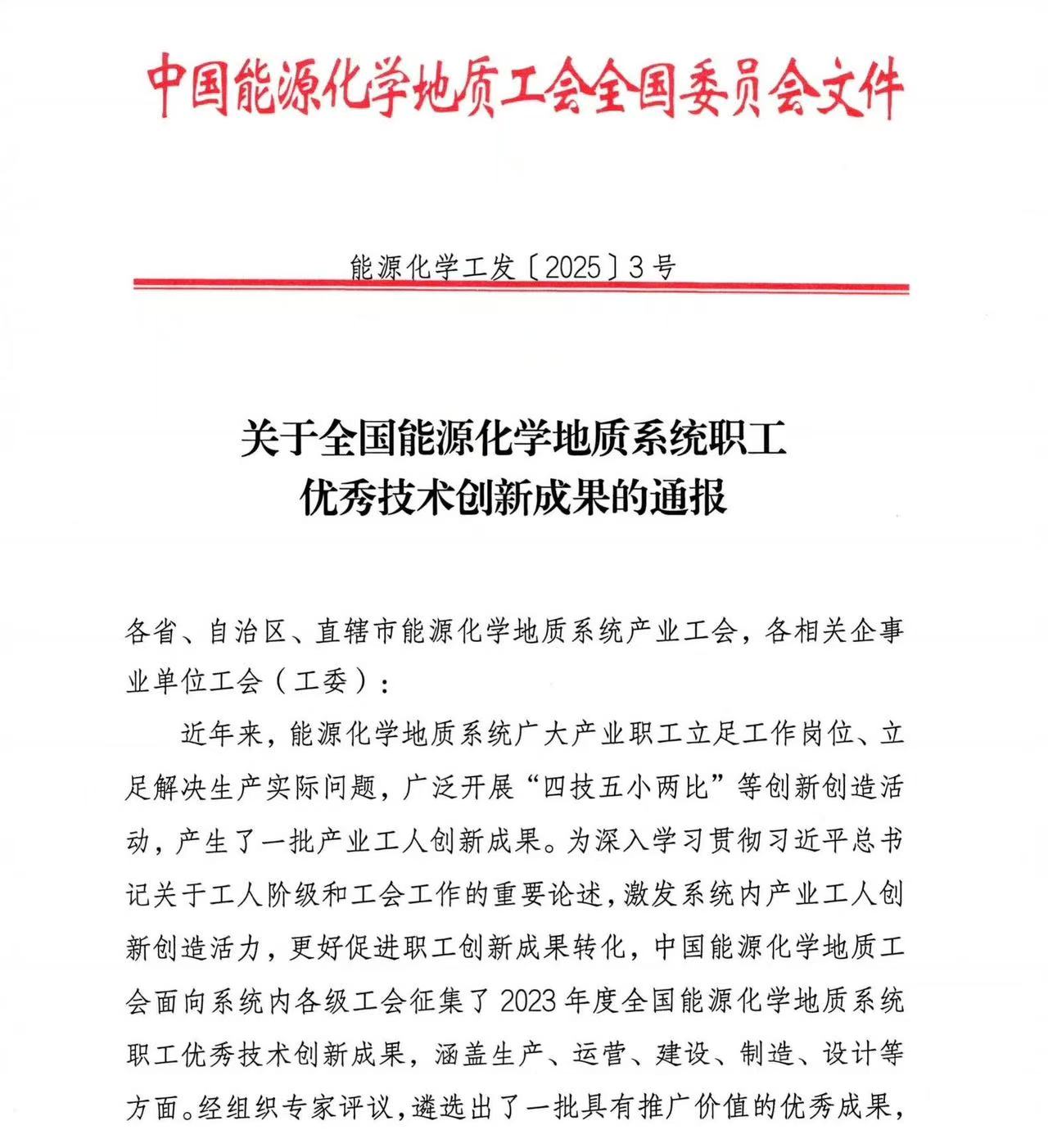 喜報!公司3項成果獲全國能源化學地質系統職工優秀技術創新成果獎