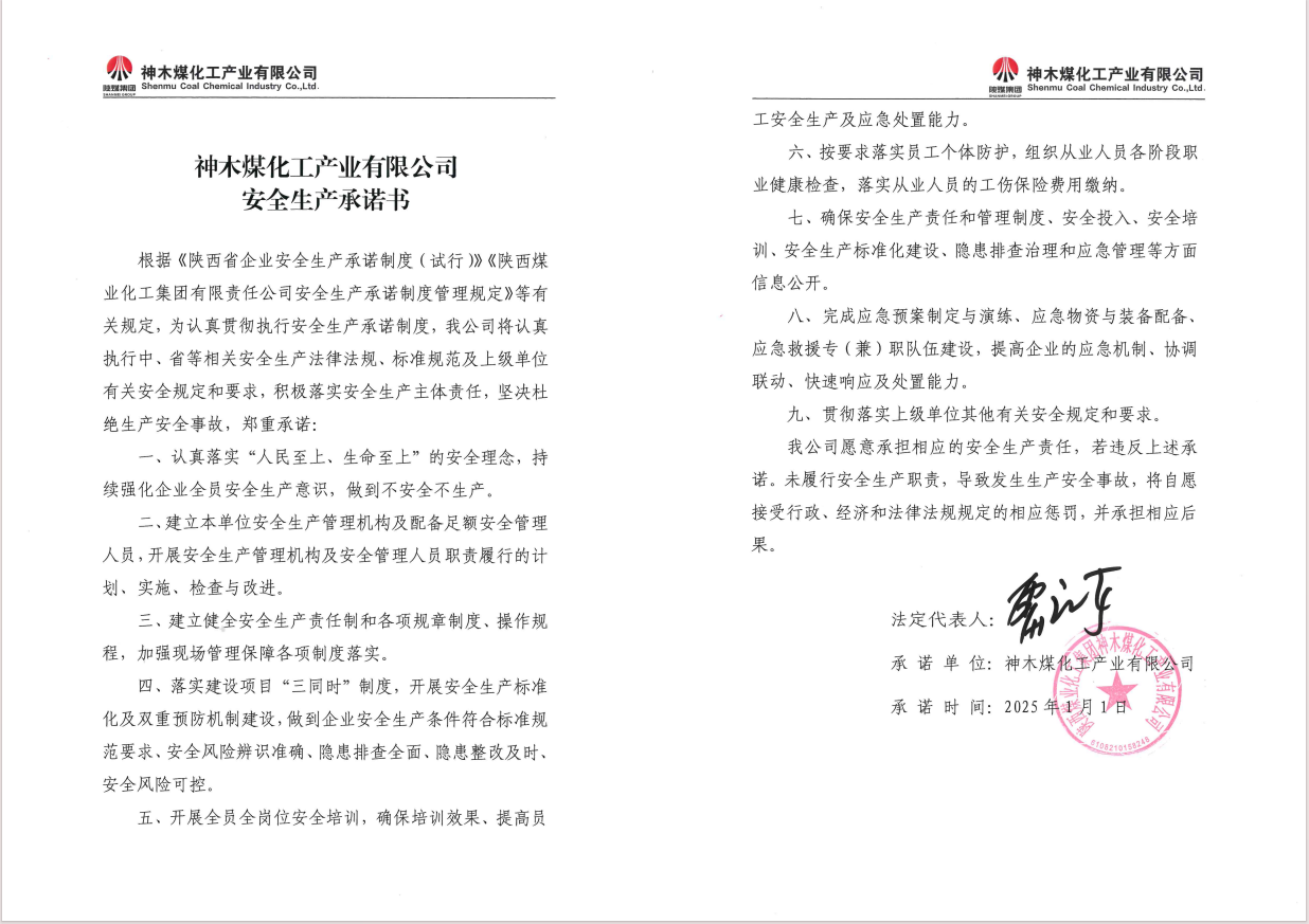 神木煤化工產(chǎn)業(yè)有限公司2025年度安全生產(chǎn)承諾書