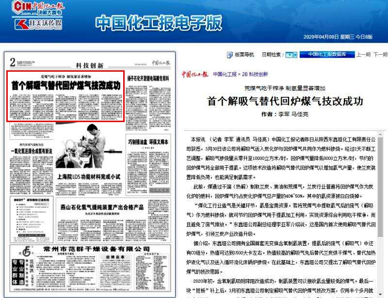 中國化工報(bào):國內(nèi)首個(gè)解吸氣替代回爐煤氣技改獲成功