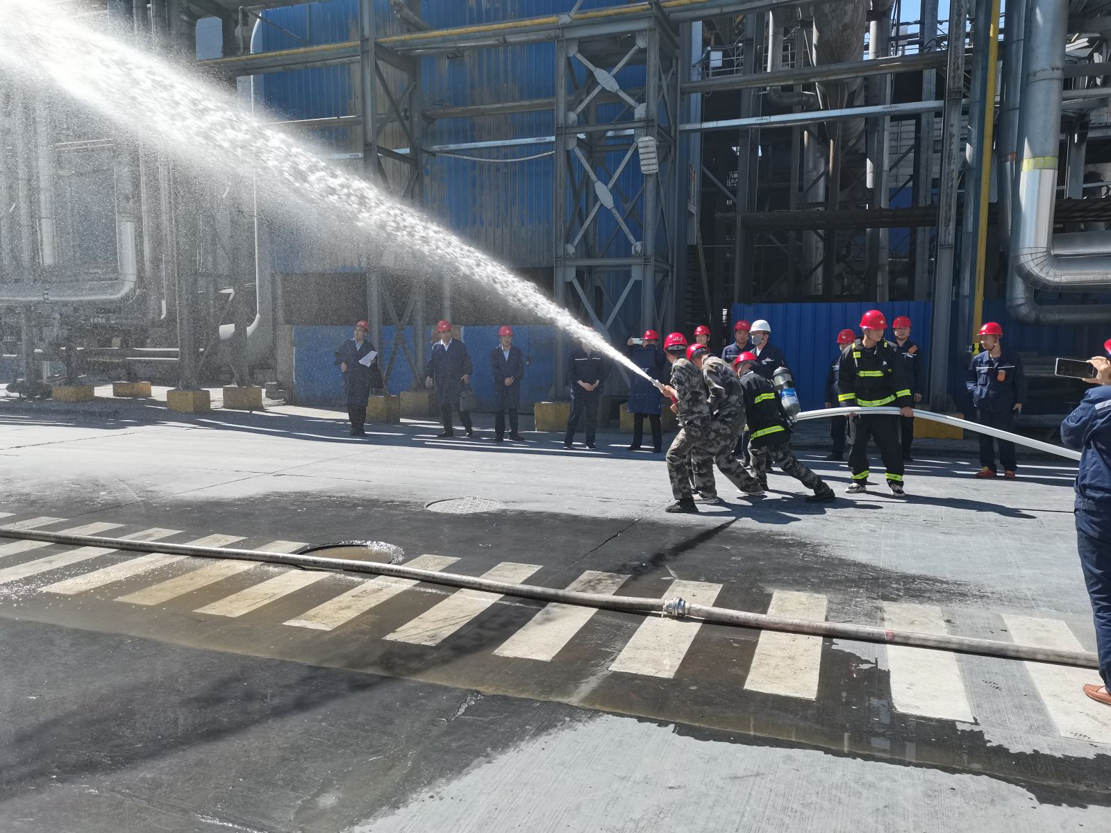 在電石分廠,雷宏春要求立即啟動火災應急預案,對該公司火災事故的應急指揮系統和事故現場應急反應能力進行檢查。當看到該公司用6分鐘時間全面啟動應急預案,消防車、各級事故應急人員到達指定現場開展滅火作業時,他表示了肯定。并向現場工作人員強調,應急救援預案演練要定期舉行,各級指揮人員要熟練掌握應急預案的各項內容,確保養兵千日,用兵一時,關鍵時刻能出手、打勝仗。