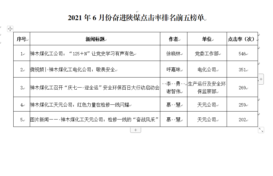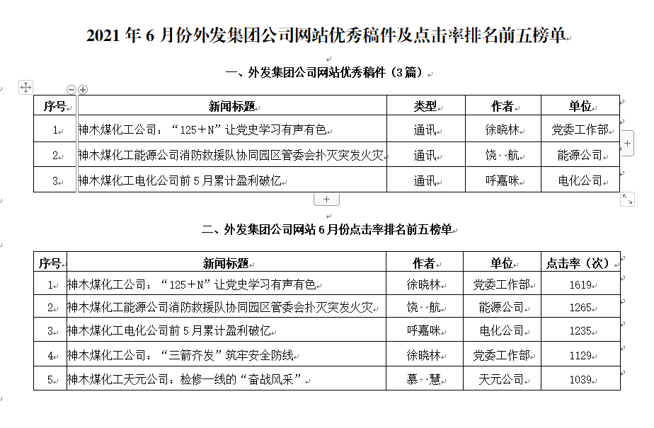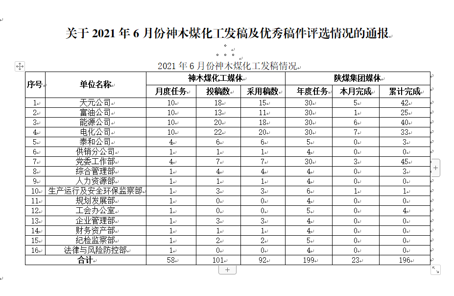 關于2021年6月份神木煤化工公司發稿及優秀稿件評選情況的通報