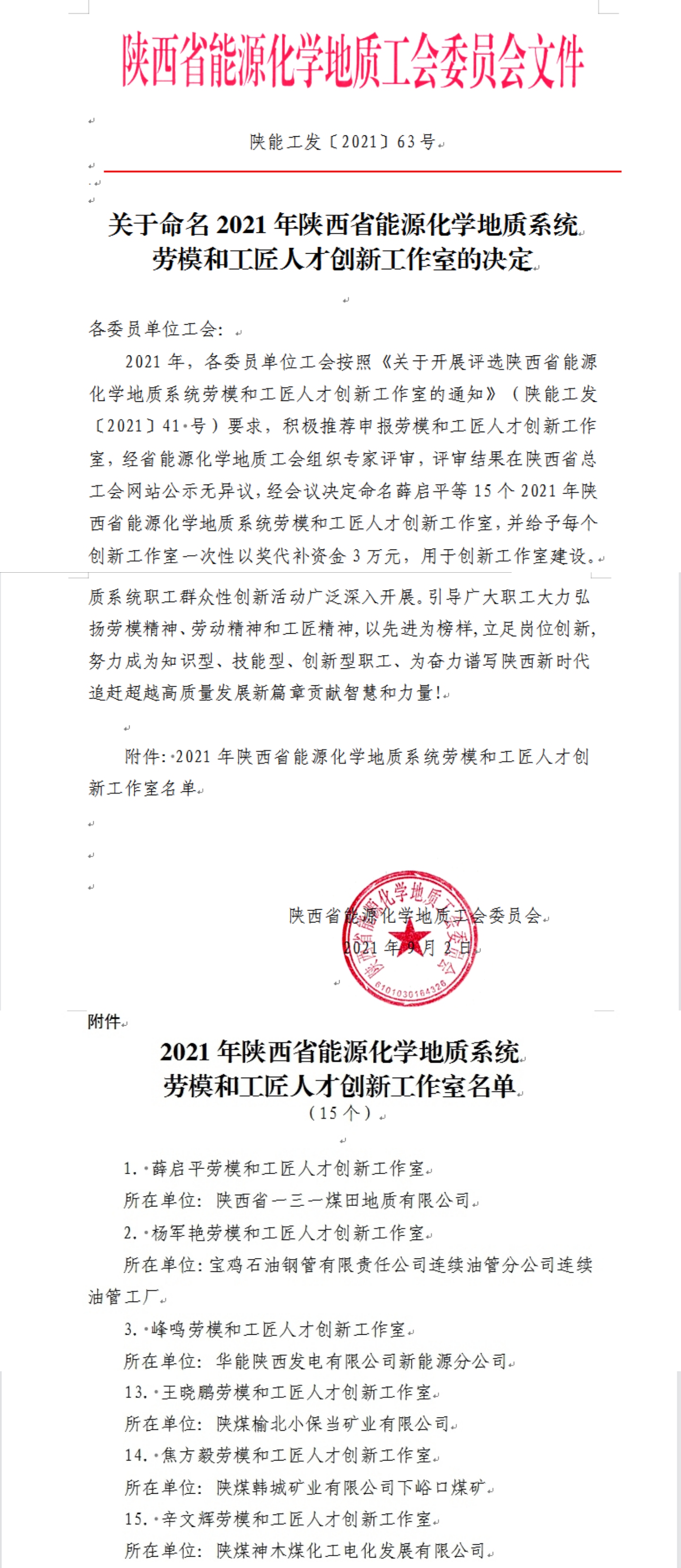近日,神木煤化工電化公司辛文輝勞模工作室被評為2021年陜西省能源化學地質系統勞模和工匠人才創新工作室。