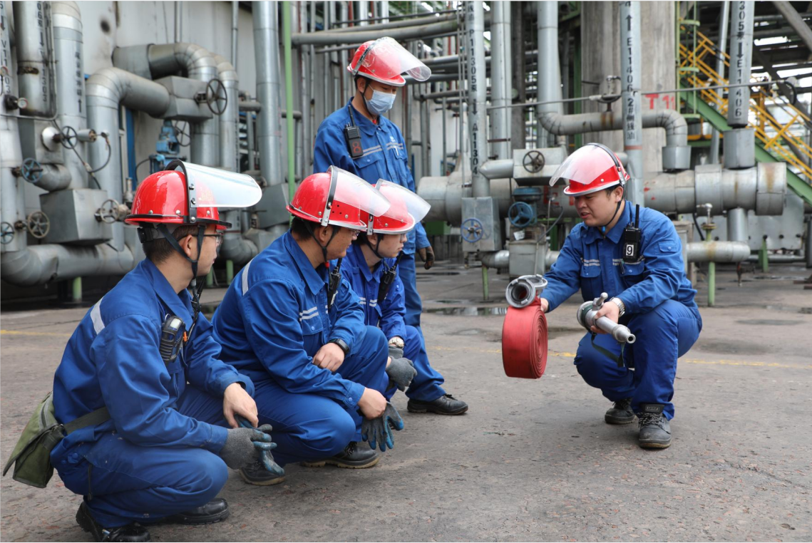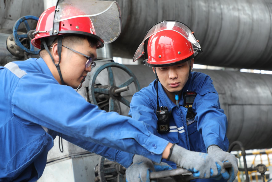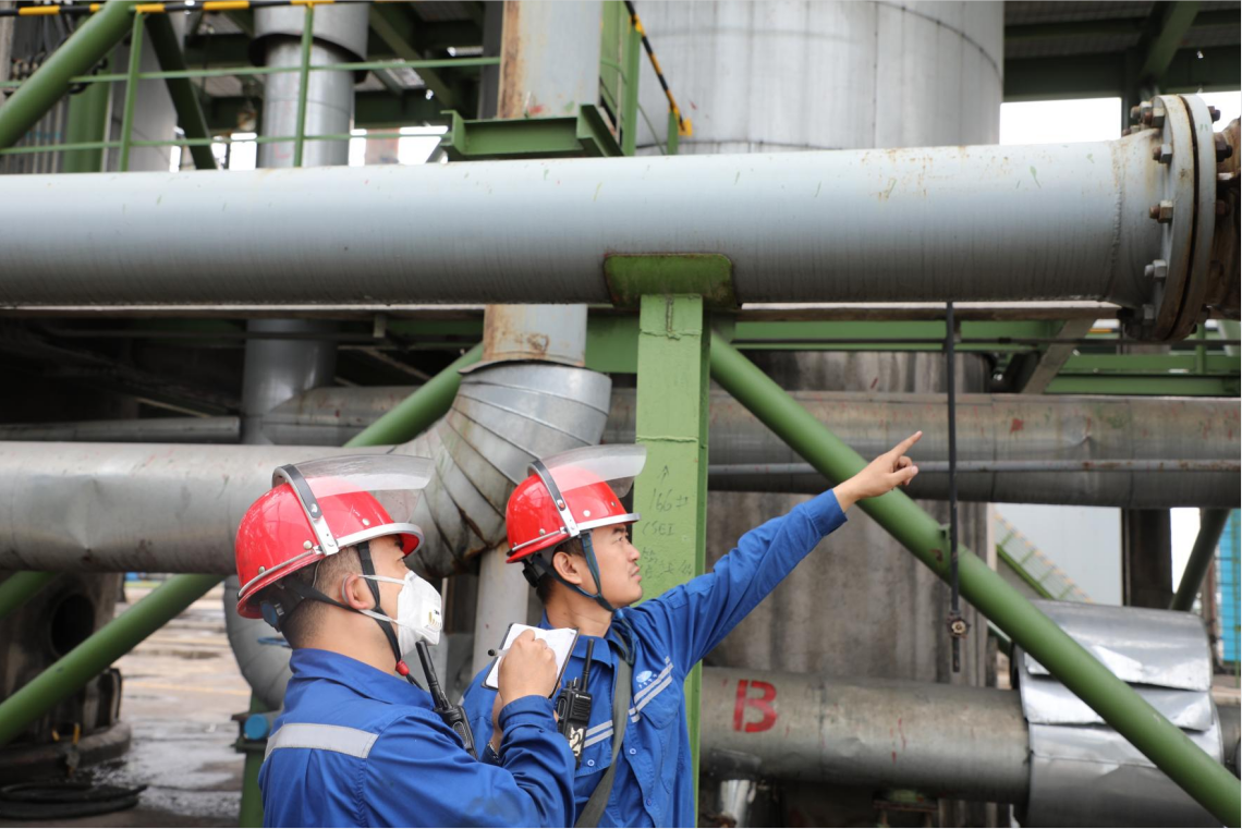兩名巡檢人員在加氫車間脫硫塔檢查法蘭是否有泄漏