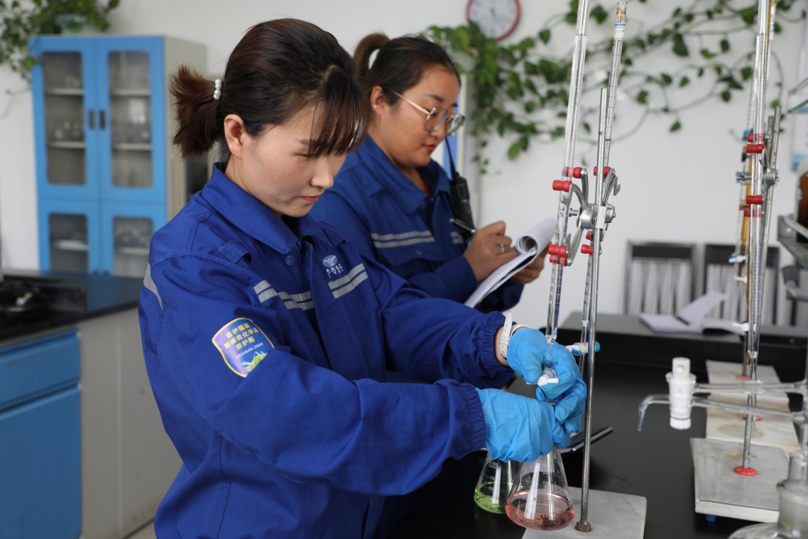 在質量監督部水質分析室,周芳芳和張艷進行滴定分析