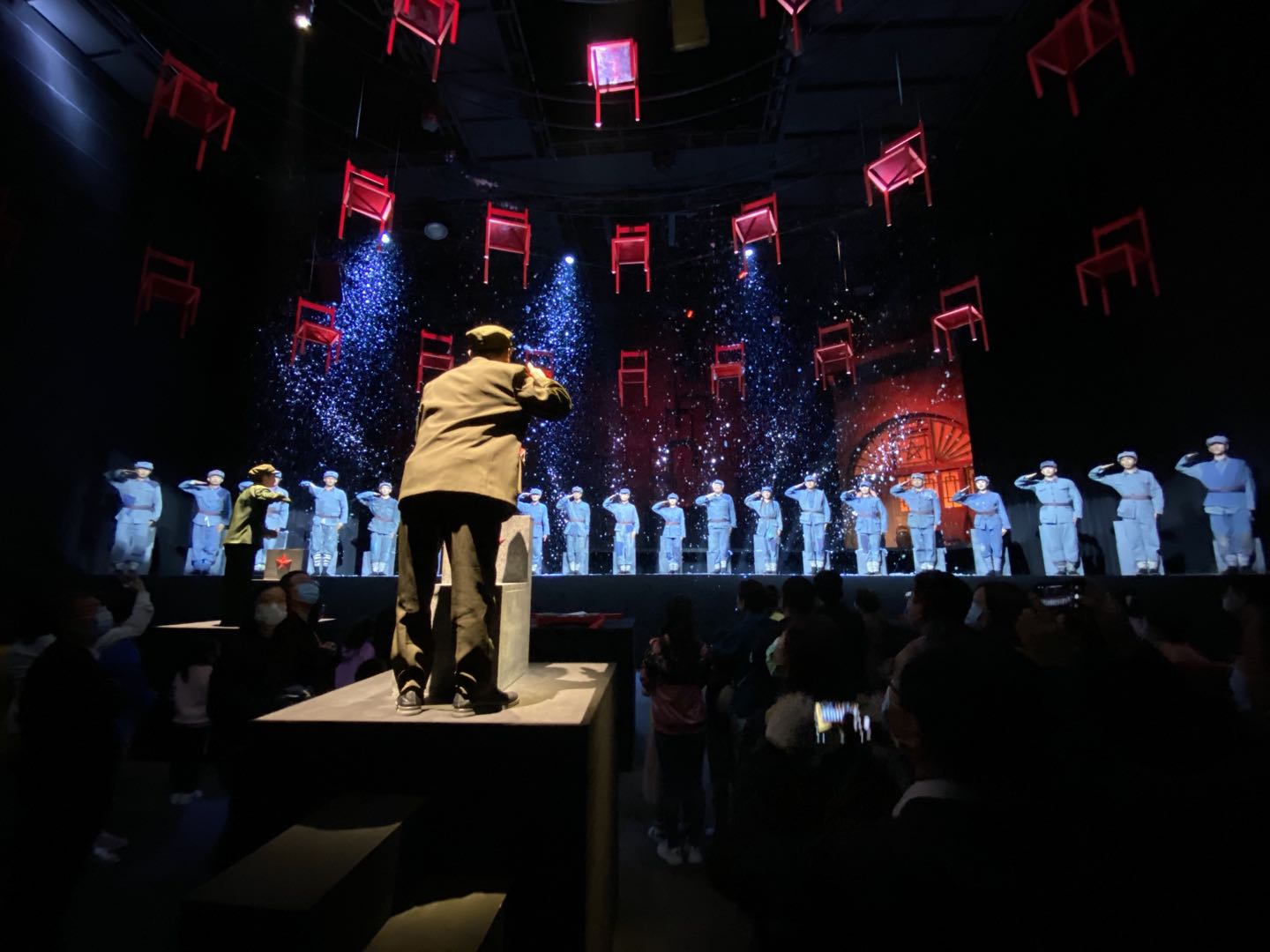 9月19日晚上7點大家在延安紅街觀看了沉浸式情景劇《再回延安》。該劇為四幕劇,以一本老紅軍的日記為線索,講述了一個紅旗班的故事,采用典型的“小人物、大主題,小場景、大視覺”的表達手法,給觀眾展示了那一路走來的心酸不易和頑強堅定的意志。故事由日記的主人劉寶順之孫以第一人稱的視角講述。不同于以往“坐著看”,此次沉浸式的演出采用了行進式“走著看”,劇情會隨著故事的推移切換場景。演出在《歌唱祖國》的大合唱中落下帷幕。