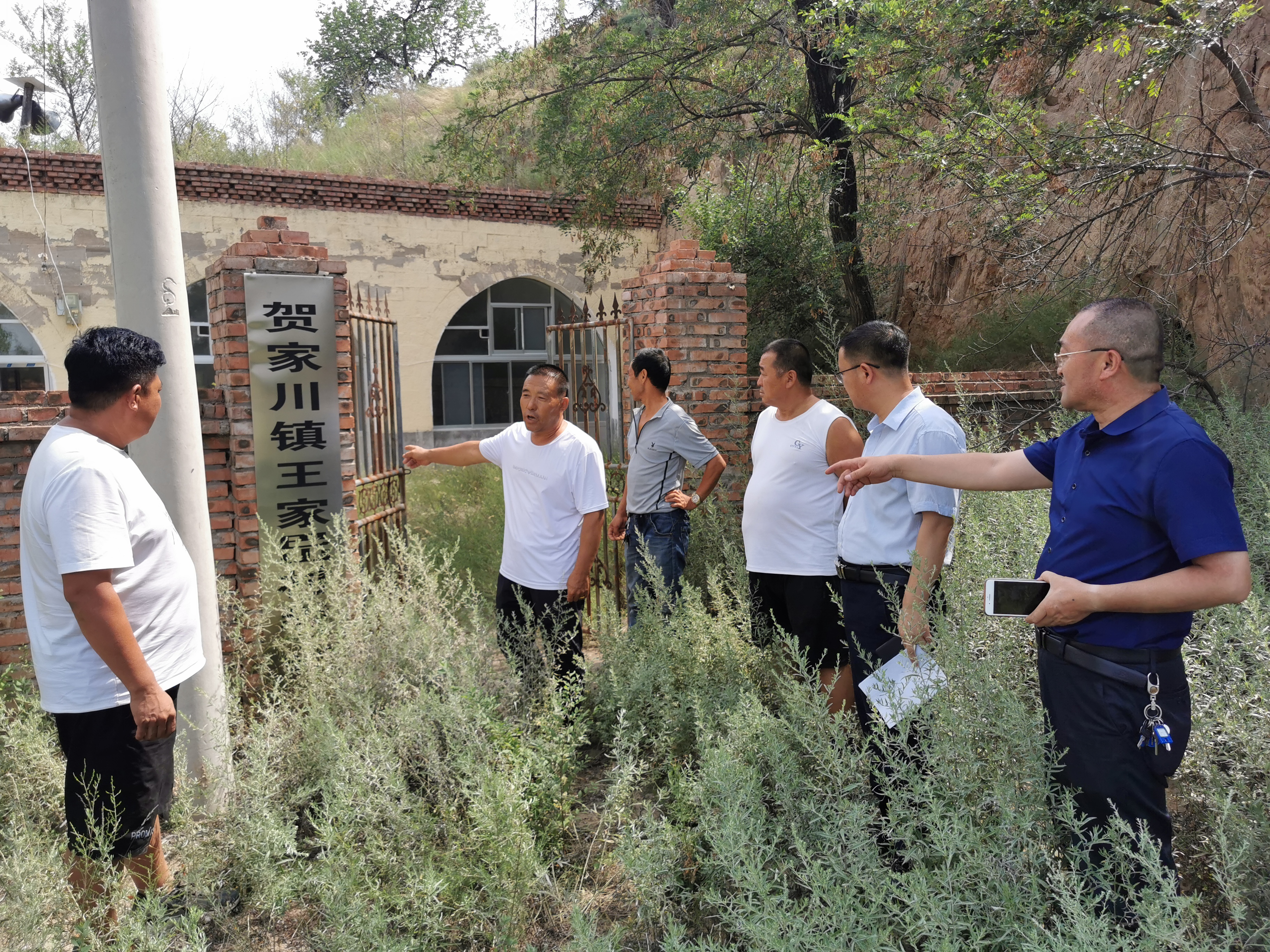 汽車沿著蜿蜒的通村路行駛,來到賀家川鎮(zhèn)楊家溝村,在后楊家溝組地壩前的棗樹下,務農歸來的三五村民、村干部以及電化公司負責“助力鄉(xiāng)村振興”的特派員,正圍在一起,共同商討為5處淤地壩加高壩楞,增設排洪口。