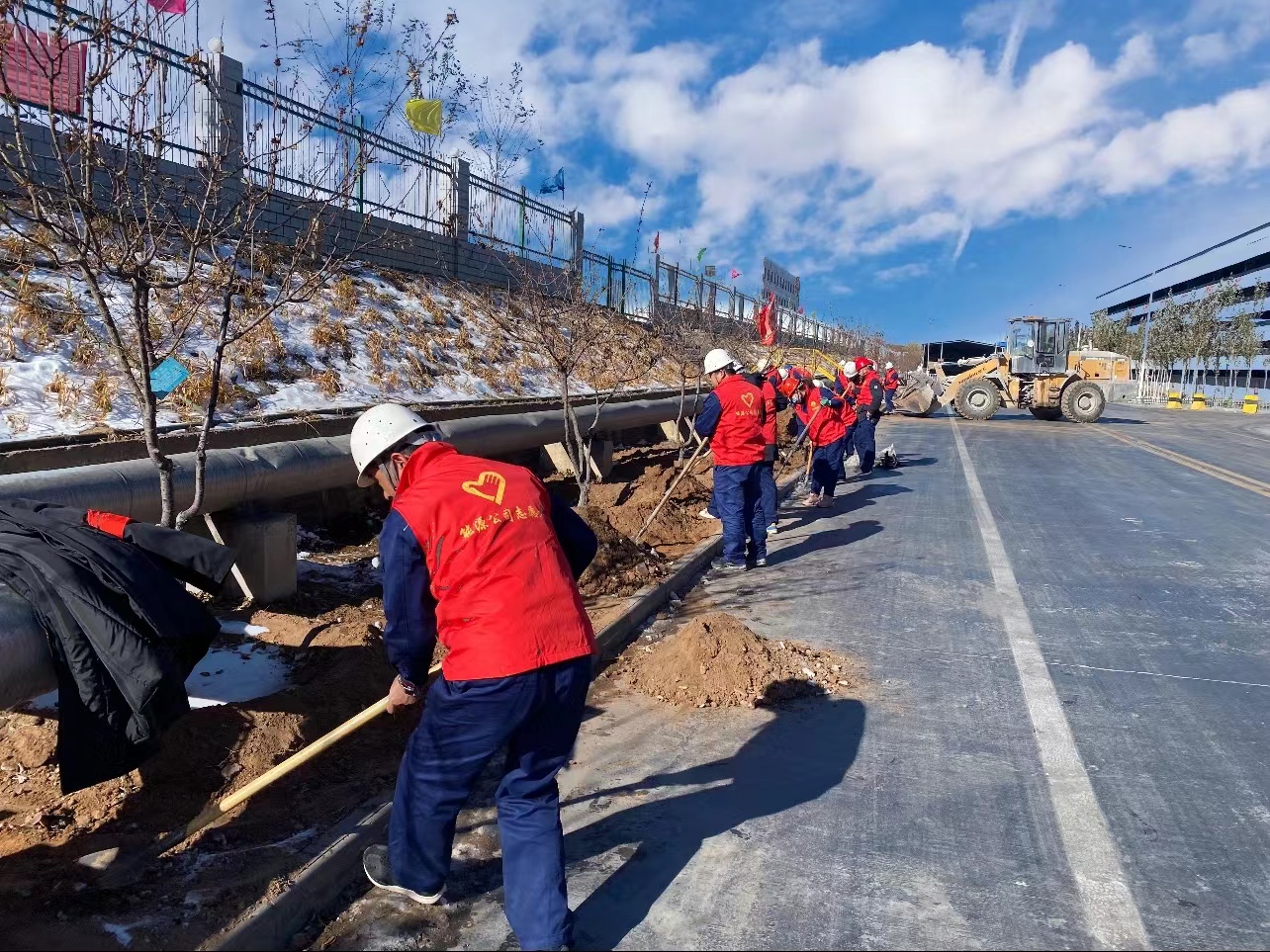 主題黨日活動(dòng)中,電化黨支部宣傳委員對(duì)人員進(jìn)行了簡(jiǎn)單分工,為大家派發(fā)了衣服、手套等工具,大家身著紅色志愿服整齊有序的前往冷卻車間外綠化帶進(jìn)行清理雜物、雜草、翻地。“以紅色力量助力綠化過冬,為明年的廠區(qū)綠化打好基礎(chǔ)。”的口號(hào)在隊(duì)伍里喊起,一時(shí)間,大家卯足了勁,在綠化帶中穿梭著,干的熱火朝天,絲毫沒有因冬天的低溫而降低勞動(dòng)熱情。經(jīng)過兩個(gè)多小時(shí)的共同勞動(dòng),綠化帶由原來的雜草枯葉變得干凈整潔。