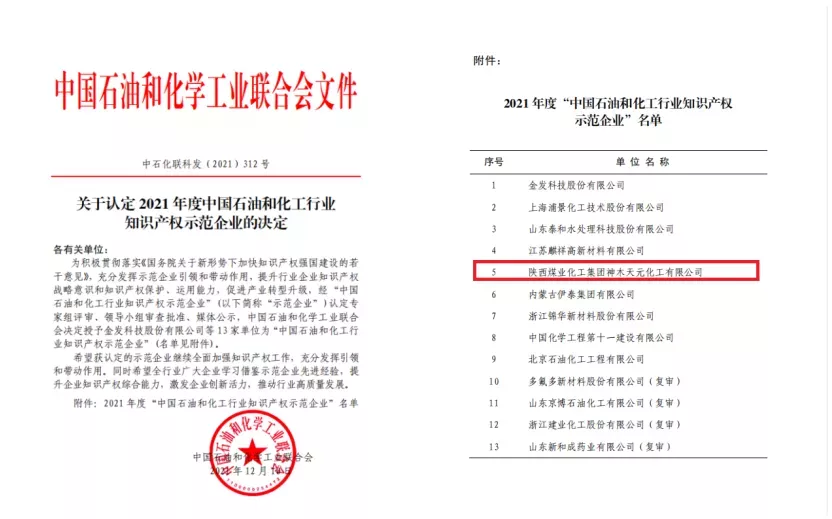 近日,中國石油和化學(xué)工業(yè)聯(lián)合會(huì)下發(fā)了《關(guān)于認(rèn)定2021年度中國石油和化工行業(yè)知識(shí)產(chǎn)權(quán)示范企業(yè)的決定》,天元公司成功入選,成為該年度陜西省唯一上榜企業(yè)。