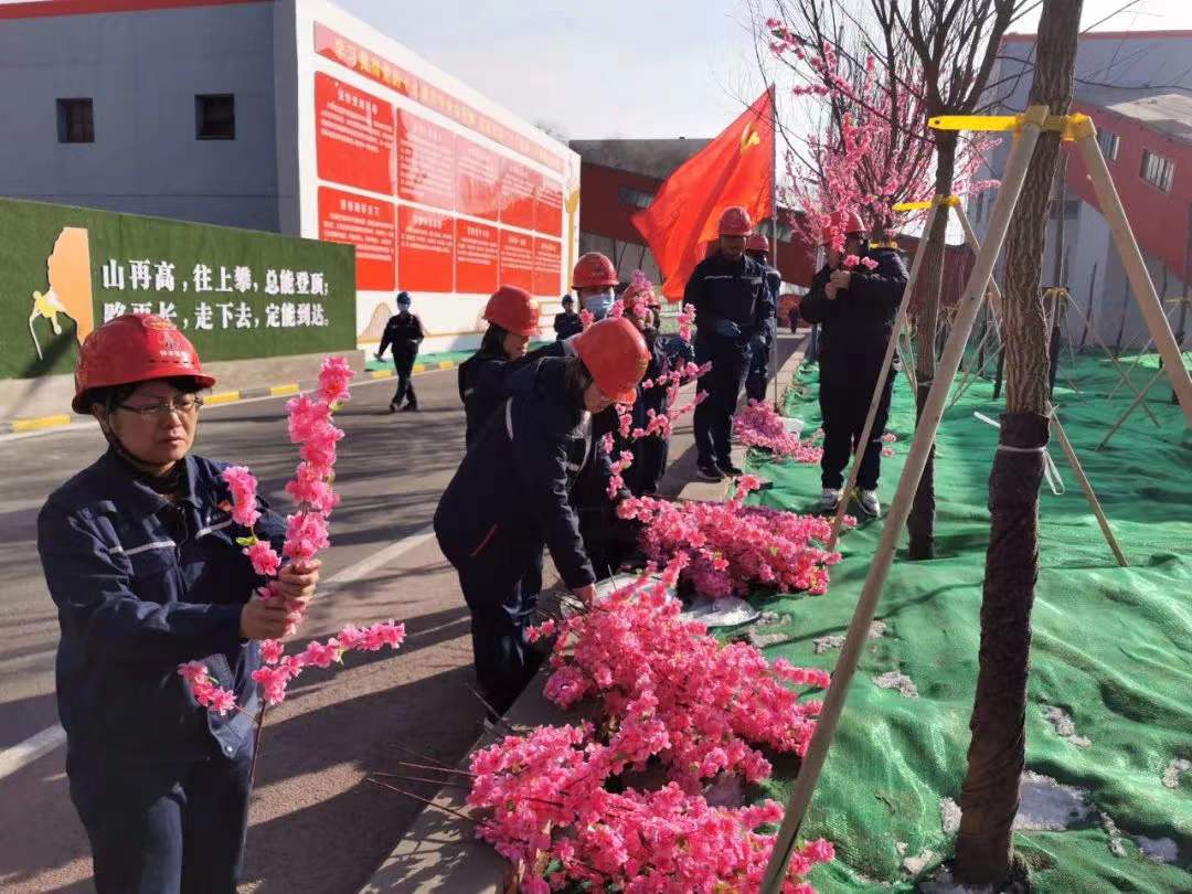 “電石黨支部認領第5區域內的桃花枝綁掛任務。”特別值得一提的是,所有綁掛任務都是由各黨支部主動認領的,結合當月的主題黨日活動開展,全體黨員爭當主人翁,自己動手扮靚廠區。高個子男同志負責爬上梯子,用扎絲將花枝牢牢捆綁在樹枝上,女同志們則發揮愛美的特長,將仿真花枝折出千姿百態,一朵朵嬌艷的桃花,一張張盛開的笑臉,大家分工協作,干得熱火朝天。