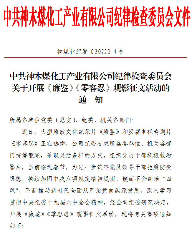 為進(jìn)一步深入推進(jìn)警示教育常態(tài)化、制度化,堅(jiān)持標(biāo)本兼治推進(jìn)黨風(fēng)廉政建設(shè),持之以恒抓細(xì)抓實(shí)黨員干部黨性黨風(fēng)黨紀(jì)教育,1月22日神木煤化工紀(jì)委在全公司范圍內(nèi)開展《廉鑒》《零容忍》觀影征文活動(dòng),充分發(fā)揮警示教育的預(yù)防和示范帶動(dòng)作用,以案釋紀(jì)、以案釋法,筑牢“不想腐”的思想防線,確保“公道正派、清正廉潔”核心理念成為黨員領(lǐng)導(dǎo)干部的思想自覺和行動(dòng)自覺,進(jìn)一步鞏固風(fēng)清氣正、干事創(chuàng)業(yè)的良好氛圍。
