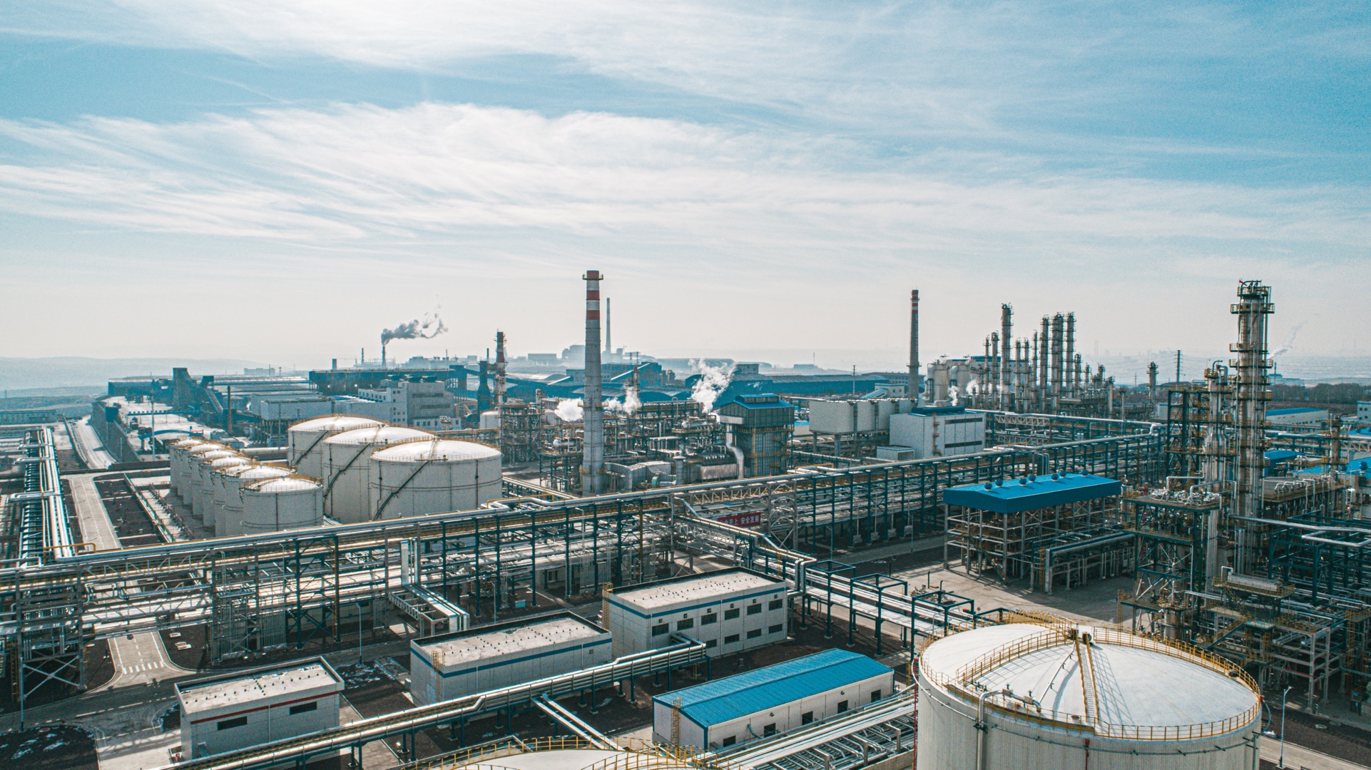 麟州大地,在藍天白云的映襯下,1210畝的主廠區,現代化的廠房和塔罐鱗次櫛比,50萬噸/年煤焦油全餾分加氫制環烷基油裝置和8萬噸/年石腦油加氫分離裝置相得益彰。