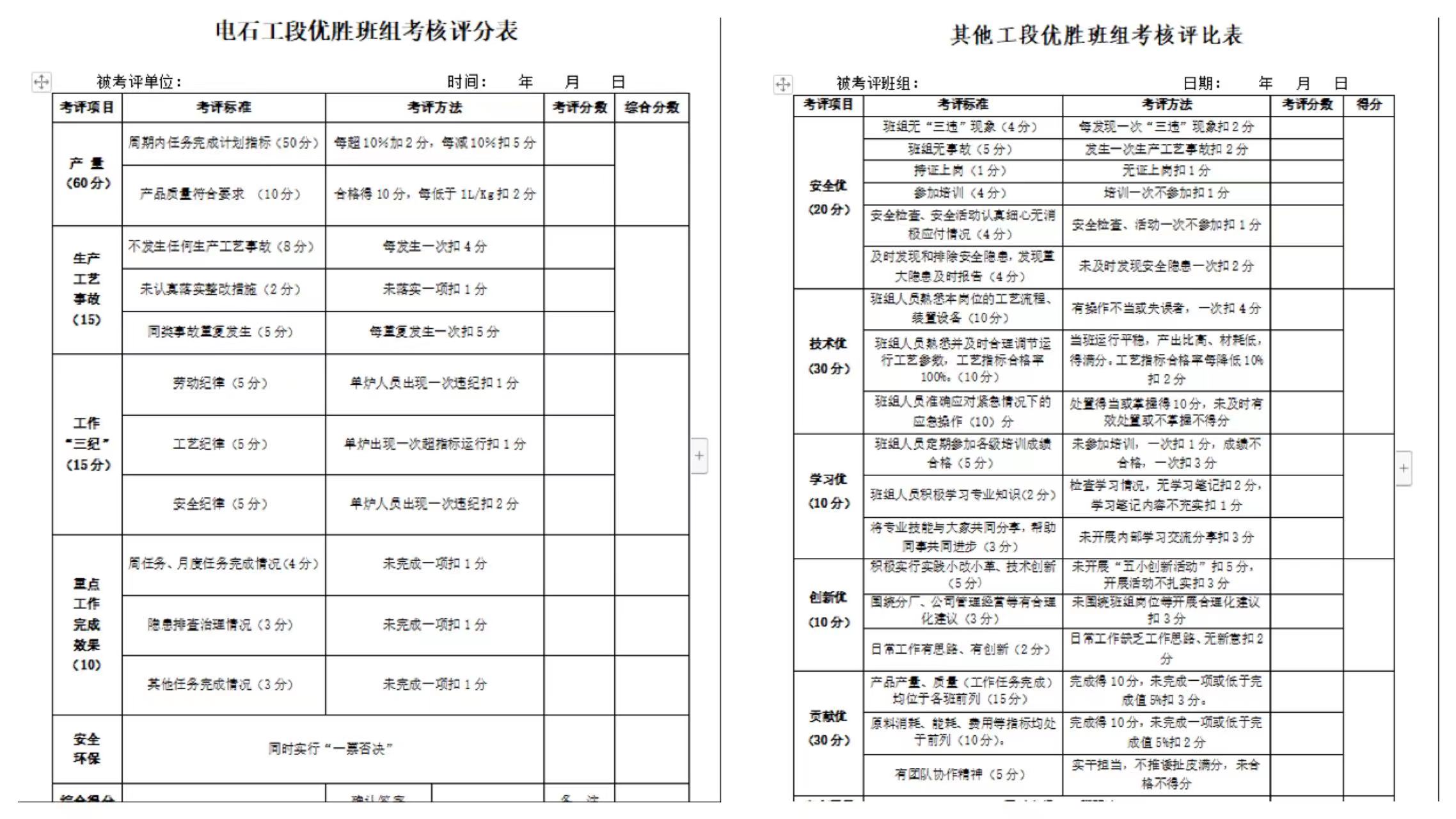 此次活動實行勞動競賽月表彰獎勵,并在公司職能部門、電石分廠、熱電分廠成立勞動競賽考評小組,根據各部門生產實際出臺了具體勞動競賽方案。評選參考指標有產量、消耗指標或工作業績、工作中的“三紀”情況、重點或關鍵工作任務完成情況、安全環保指標,同時實行“一票否決”制。其目的就是在“比安全、比技能、比創新,爭第一、爭效益、爭榮譽”上下足功夫,對各班組競賽情況進行認真評比考核,確保勞動競賽各項工作落實到位。