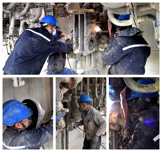下午2:00,現場搶修工作全面鋪開,泰和公司副總經理王廷及各管理人員現場指揮,對搶修工作進行現場指導,確保施工安全、進度有序推進。各搶修人員堅持各自既定工作崗位,工作有條不紊,兩個焊工蹲在狹小的工作空間,不顧爐體高溫的灼熱,不時變換著姿勢,一絲不茍的進行焊接。其他人員也不示弱,都積極的干好自己的工作。